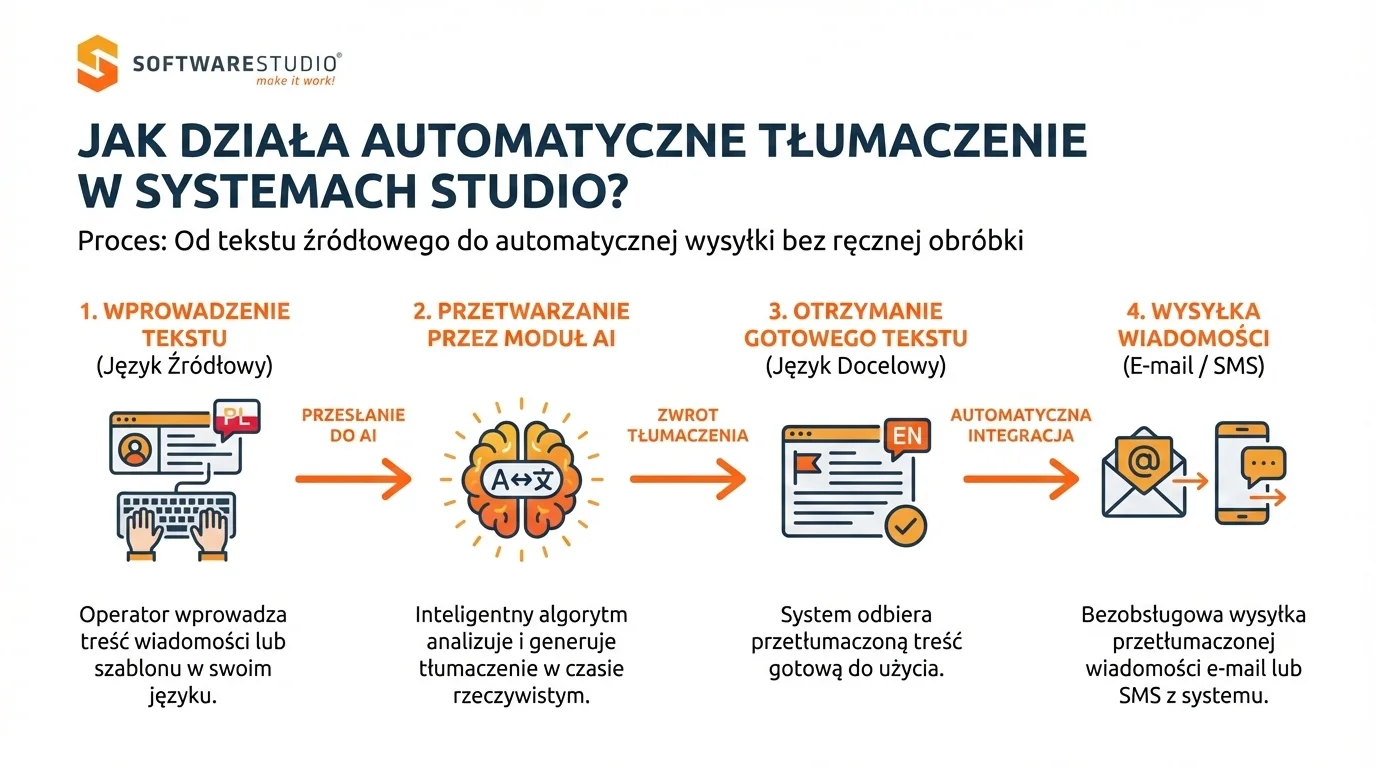 | Komunikacja e-mail/SMS | Wszystkie systemy Studio | Automatyczne tłumaczenie powiadomień | Eliminacja barier językowych w czasie rzeczywistym |