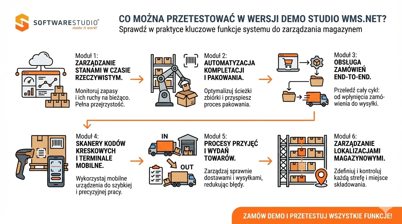 Demo WMS bez zobowiązań! Odkryj, jak Studio WMS.net automatyzuje przyjęcia, lokowanie i wysyłki. Test na żywych danych, integracja ze skanerami kodów kreskowych, raporty w czasie rzeczywistym. Przekonaj się sam – DEMO dostępne 24/7!