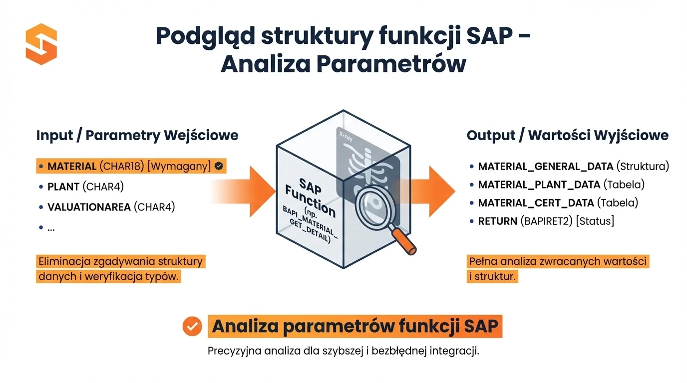 Poznawanie struktury funkcjiRęczne przeglądanie dokumentacji SAP, zgadywanie parametrówAutomatyczny podgląd struktury funkcji i wszystkich parametrów wejściowych/wyjściowychSkrócenie czasu przygotowania zapytań, eliminacja błędów strukturalnych