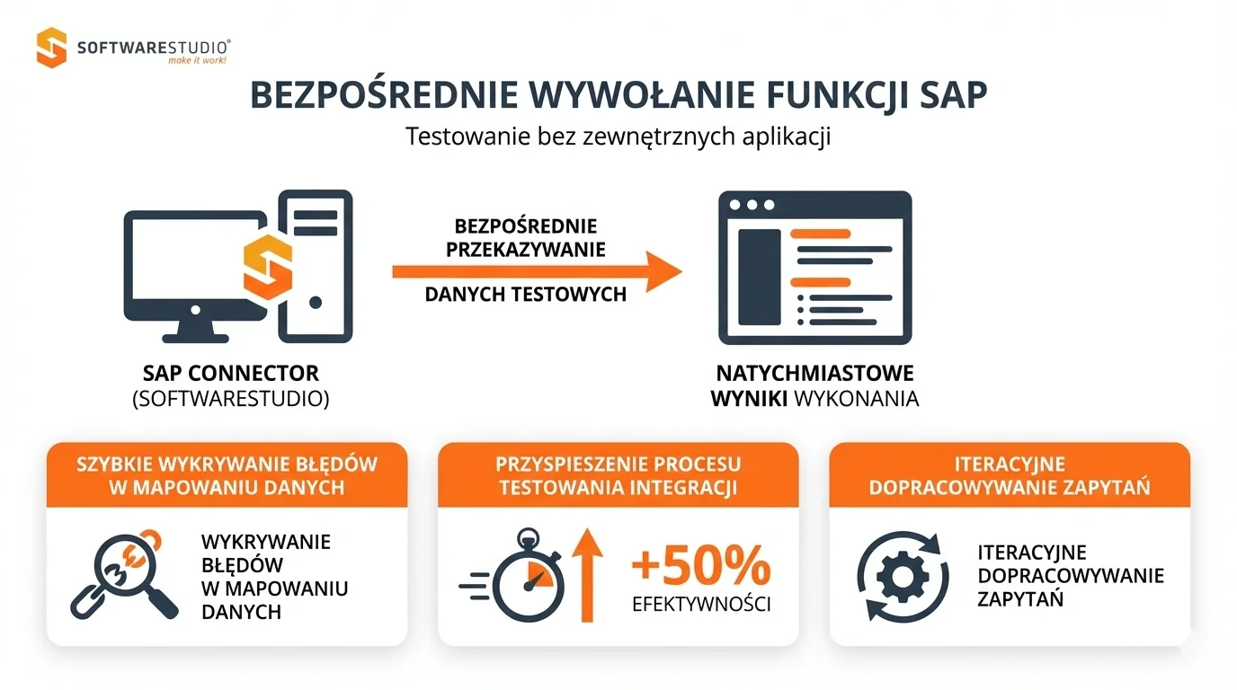 Schemat bezpośredniego wywołania funkcji SAP przez SAP Connector SoftwareStudio zwiększający efektywność testowania.