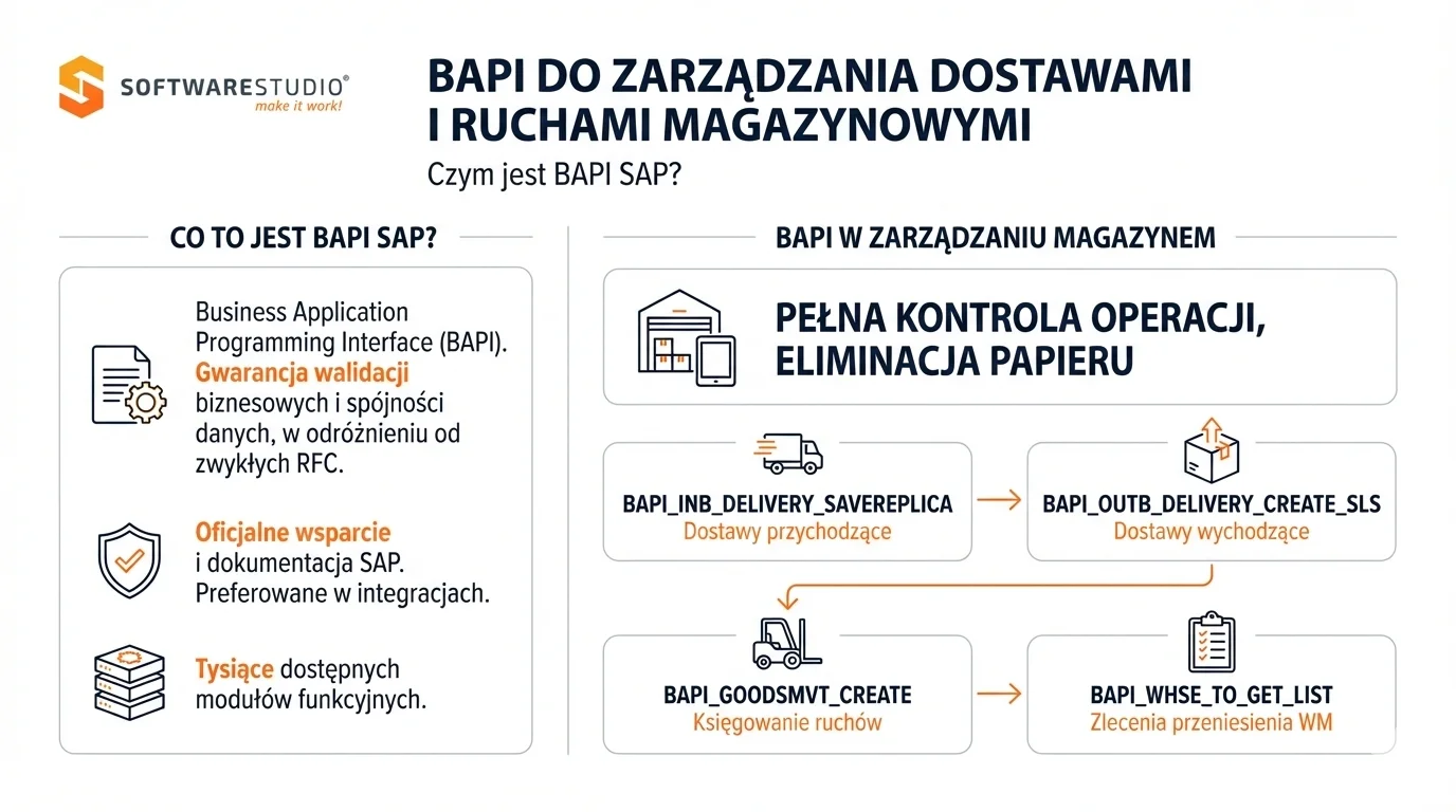 Infografika SoftwareStudio wyjaśniająca wykorzystanie BAPI SAP w zarządzaniu dostawami i ruchami magazynowymi WMS.